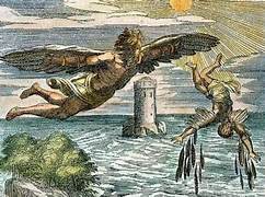 Ambos iniciaron el vuelo, escapando de su encierro. Pero Ícaro, viendo la belleza del Sol, pasó por alto las indicaciones de su padre y voló cada vez más alto, intentando acercarse hasta casi tocar el sol. Pero las alas no resistieron el calor, deshaciéndose y provocando que Ícaro se precipitará al vacío y muriera".